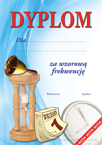 Dyplom za wzorową frekwencję format: A4 jednostronny Wykonany na specjalnym matowym papierze do drukarek atramentowych.