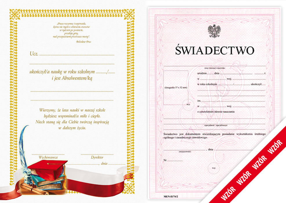 Teczka z praktycznym ,,skrzydełkiem” umożliwiającym włożenie do środka zarówno świadectwa jak i innych dokumentów.